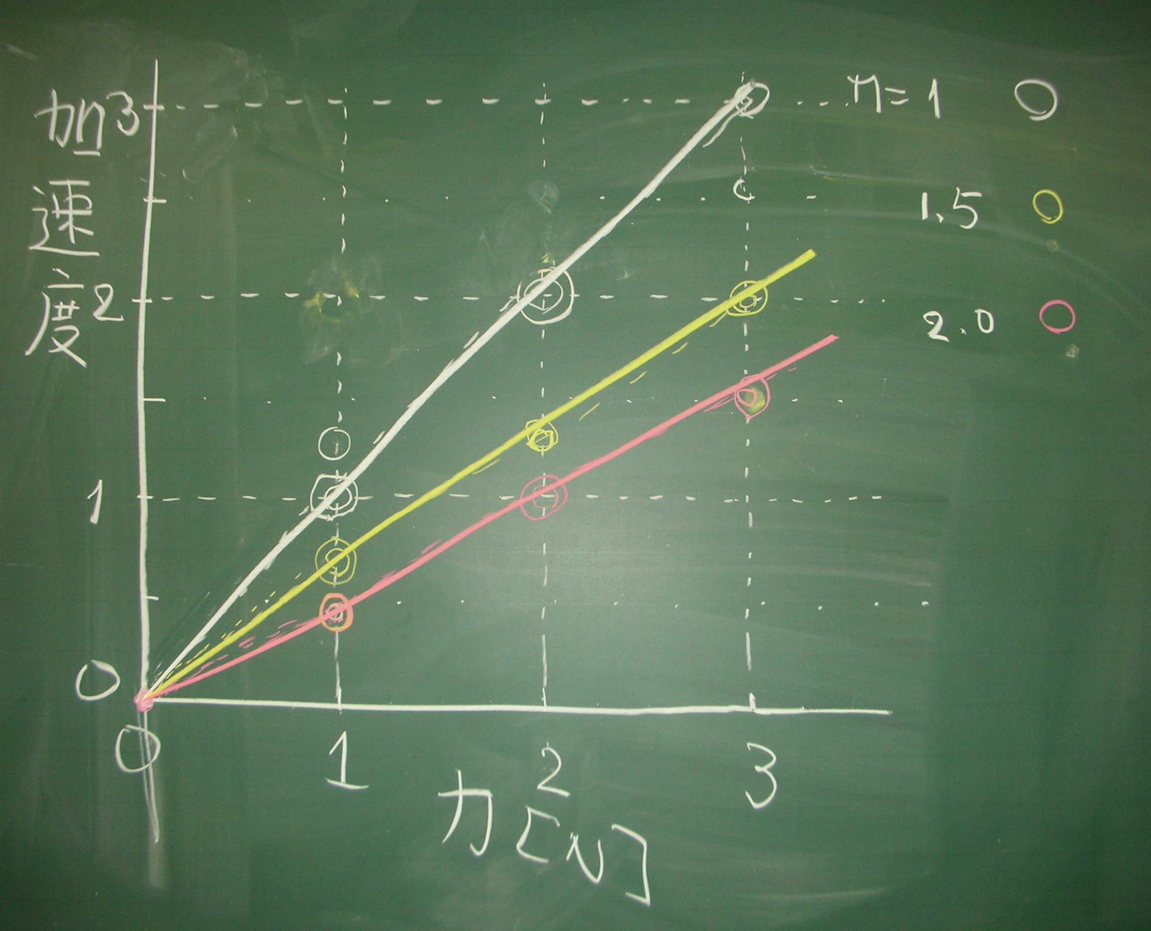 物体に力が働くと、加速度が生じる。加速度は,力に比例し、質量に反比例する。 力の大きさと質量のいろいろな組み合わせに,運動を行わせ、運動の様子を観察し、 観測用のデータを印刷して、付録Bのように解析し、運動の法則を求めてください。